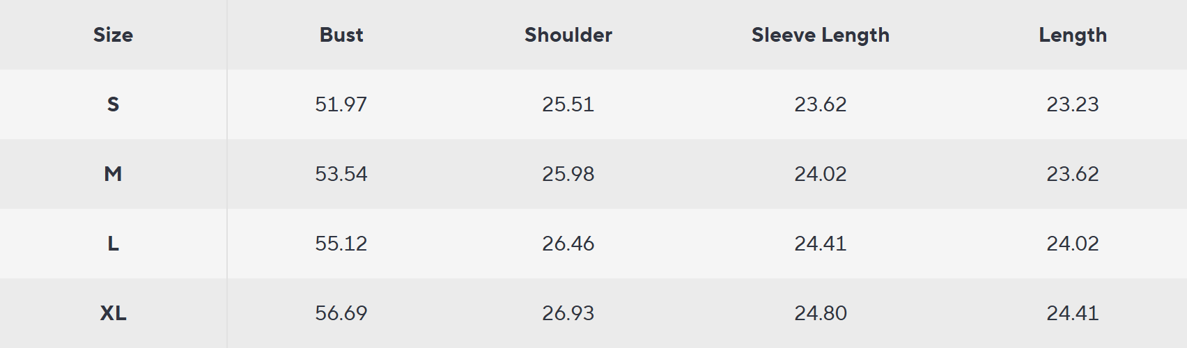 Size chart measurements are taken in inches.
